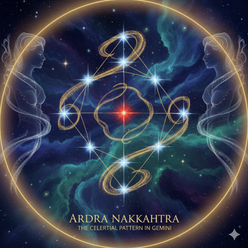 Ardra Nakshatra, the sixth constellation in the celestial tapestry of Vedic astrology, embodies the raw power of cosmic storms and the transformative force of divine destruction. Spanning from 6°40′ to 20°00′ in Gemini, this nakshatra represents the necessary chaos that precedes renewal, the tears that cleanse the soul, and the storms that clear the path for new growth.